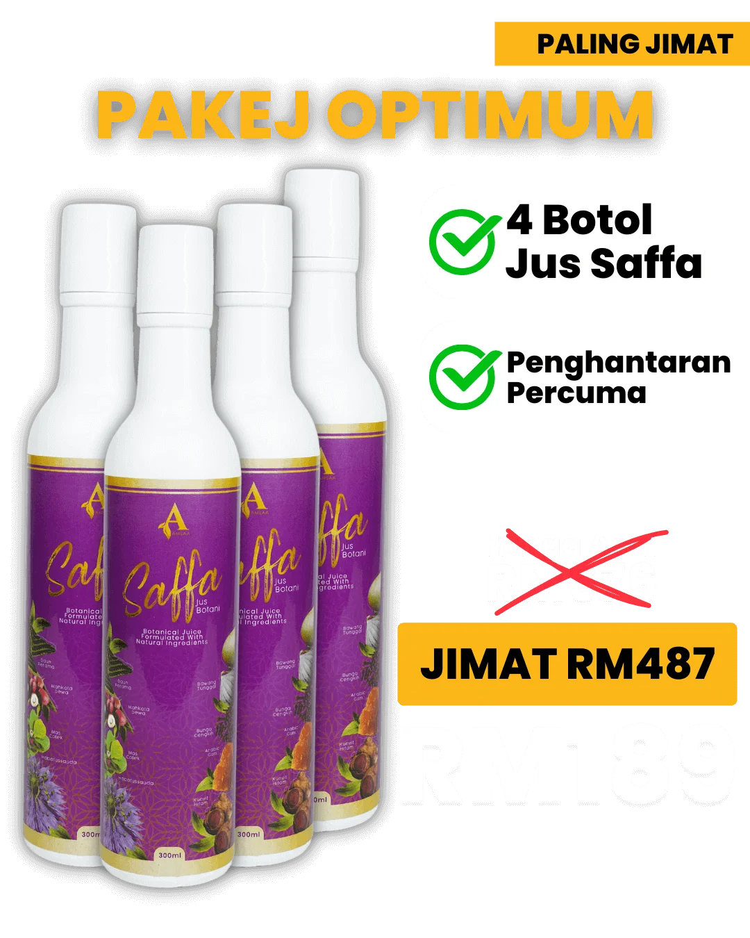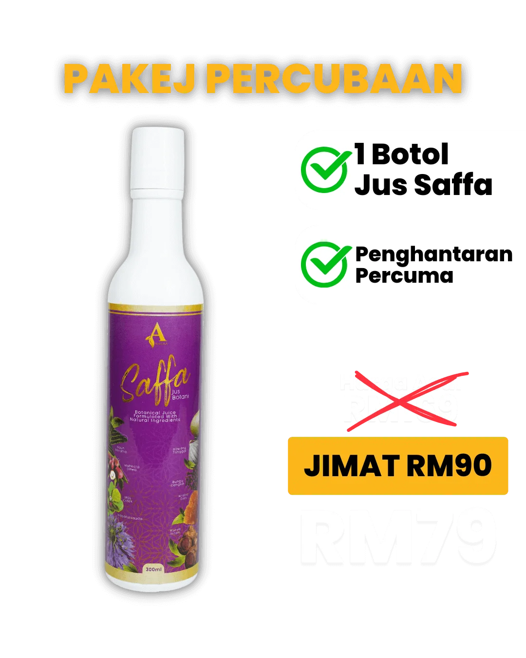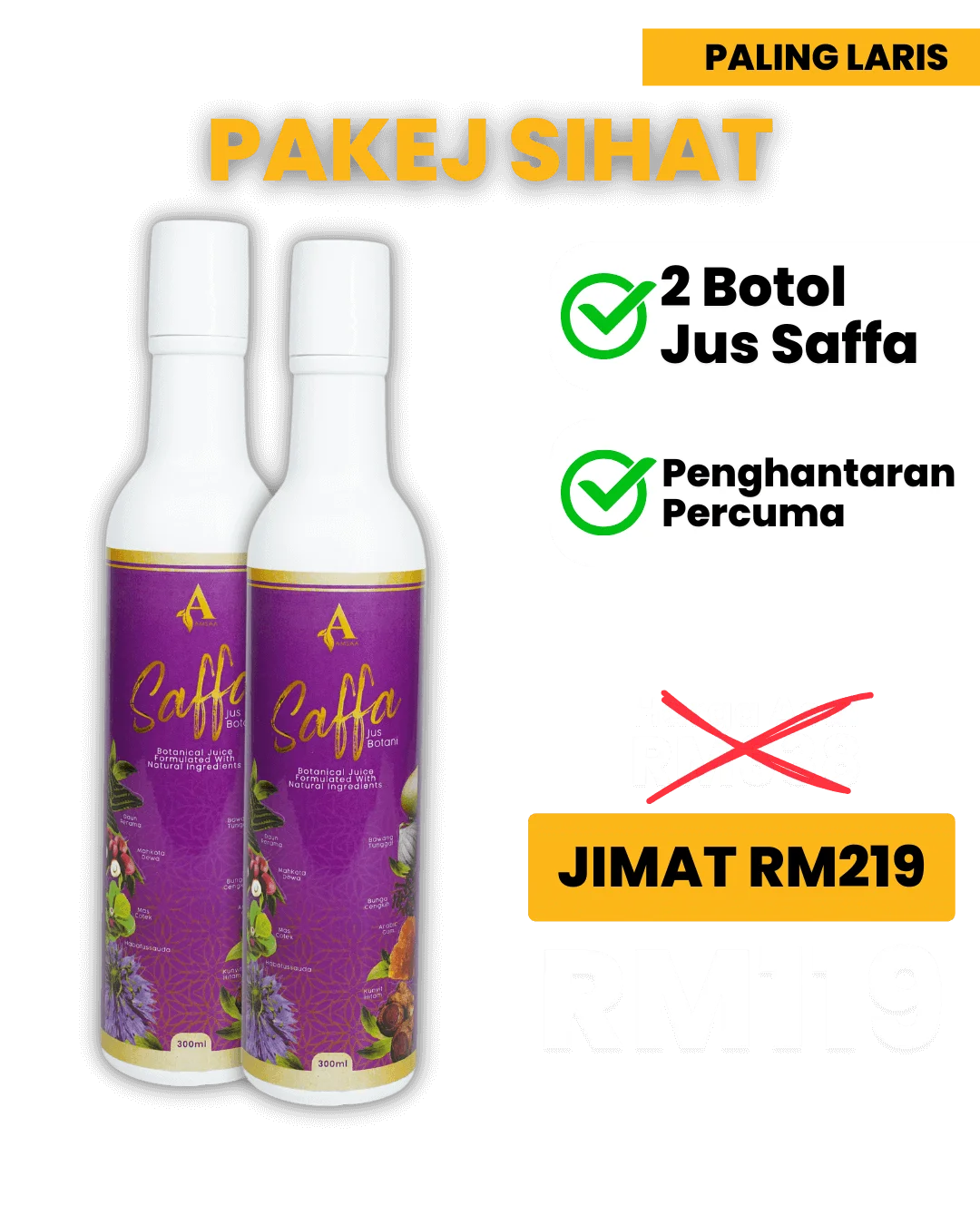 Jus Botani Saffa adalah rawatan lengkap untuk tubuh anda. Sesuai untuk kencing manis, darah tinggi, gout, kolestrol, stroke dan penyakit jantung.